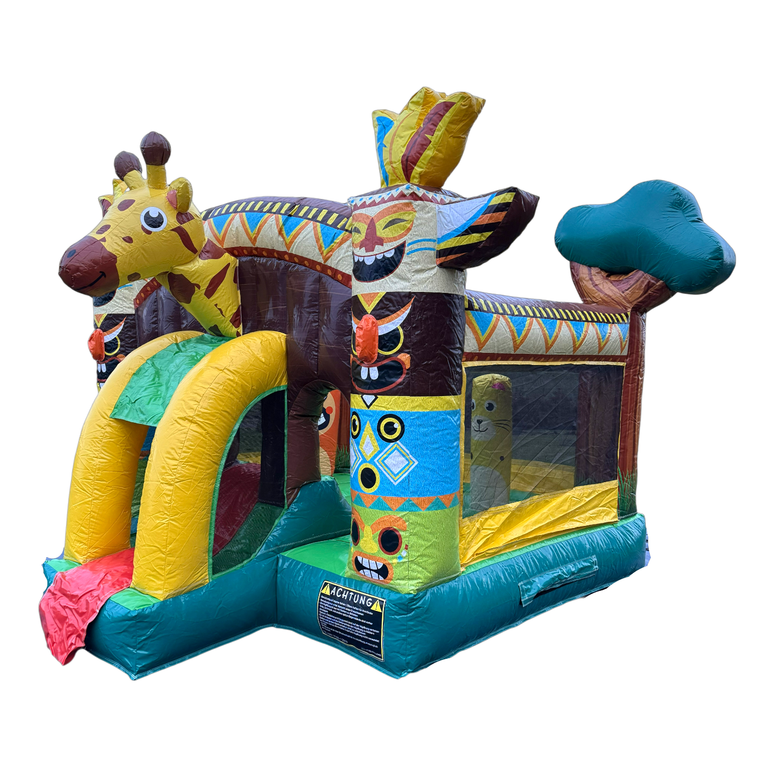 Mit dieser Hüpfburg beginnt die große Safari direkt im eigenen Garten! Die fröhliche Giraffe, bunten Muster und liebevollen Tiermotive entführen Kinder in eine Welt voller Abenteuer, Spiel und Fantasie.