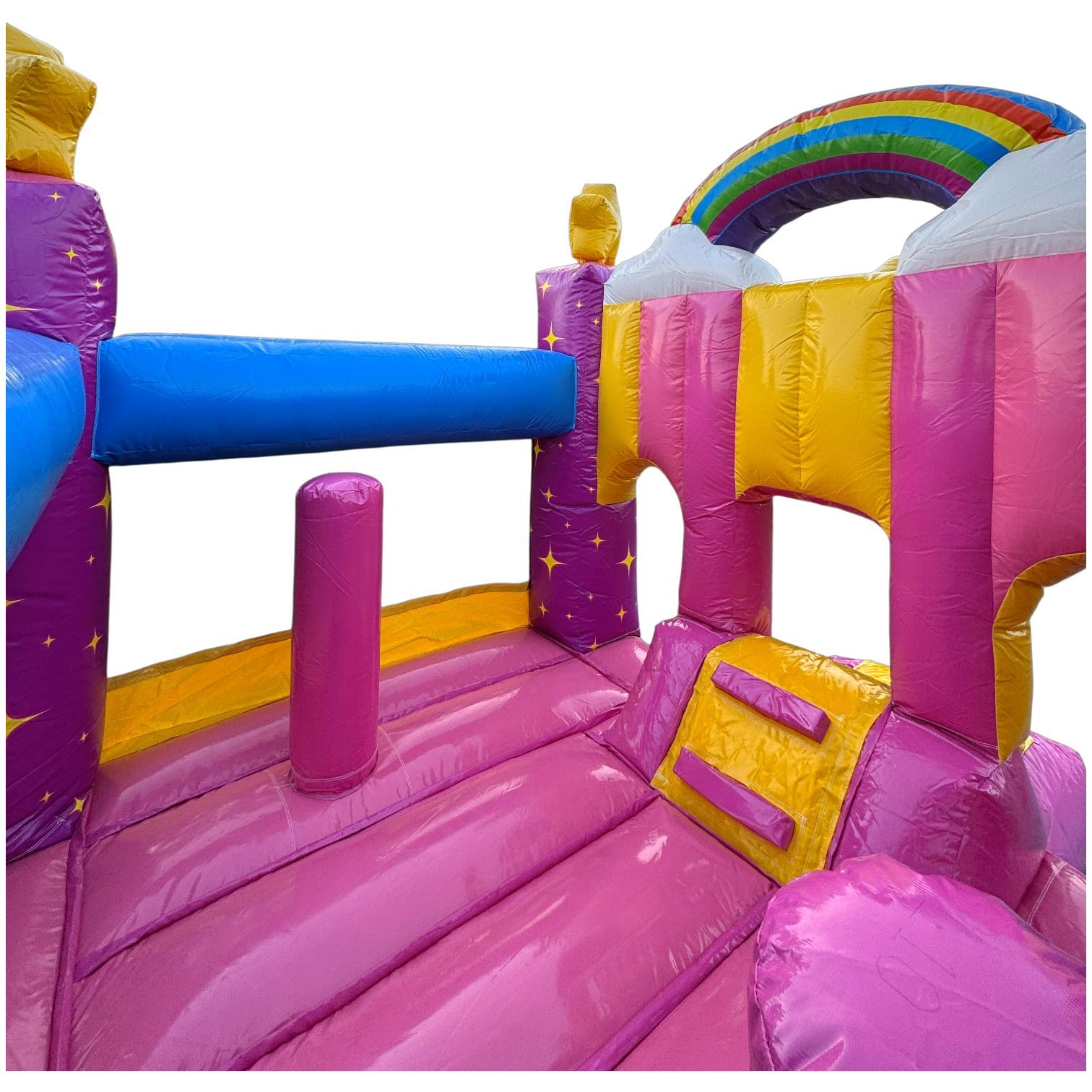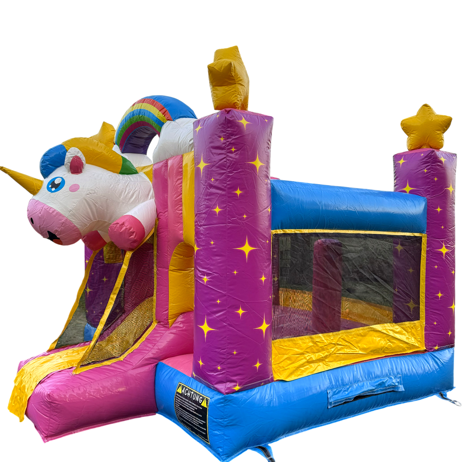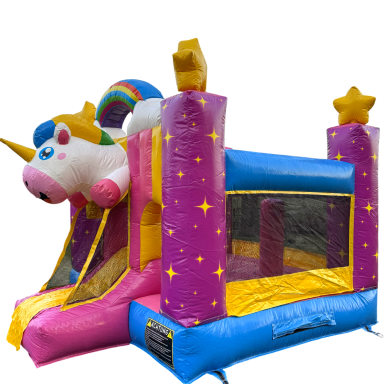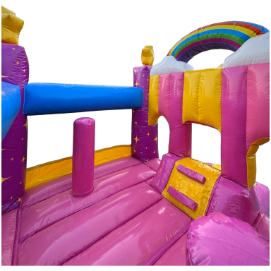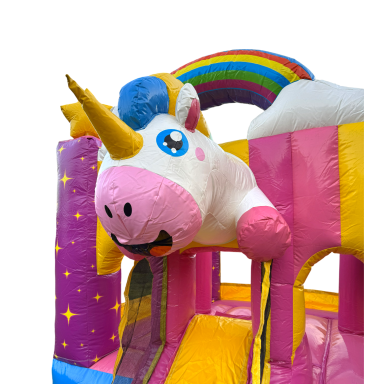 Diese zauberhafte Einhorn-Hüpfburg ist der perfekte Hingucker für jedes Kinderfest! Trotz ihrer kompakten Größe bietet sie jede Menge Platz zum Toben, Springen und Lachen. Das farbenfrohe Design mit Regenbogen, Sternen und dem süßen Einhorn-Motiv lässt Kinderaugen strahlen und sorgt sofort für gute Laune.