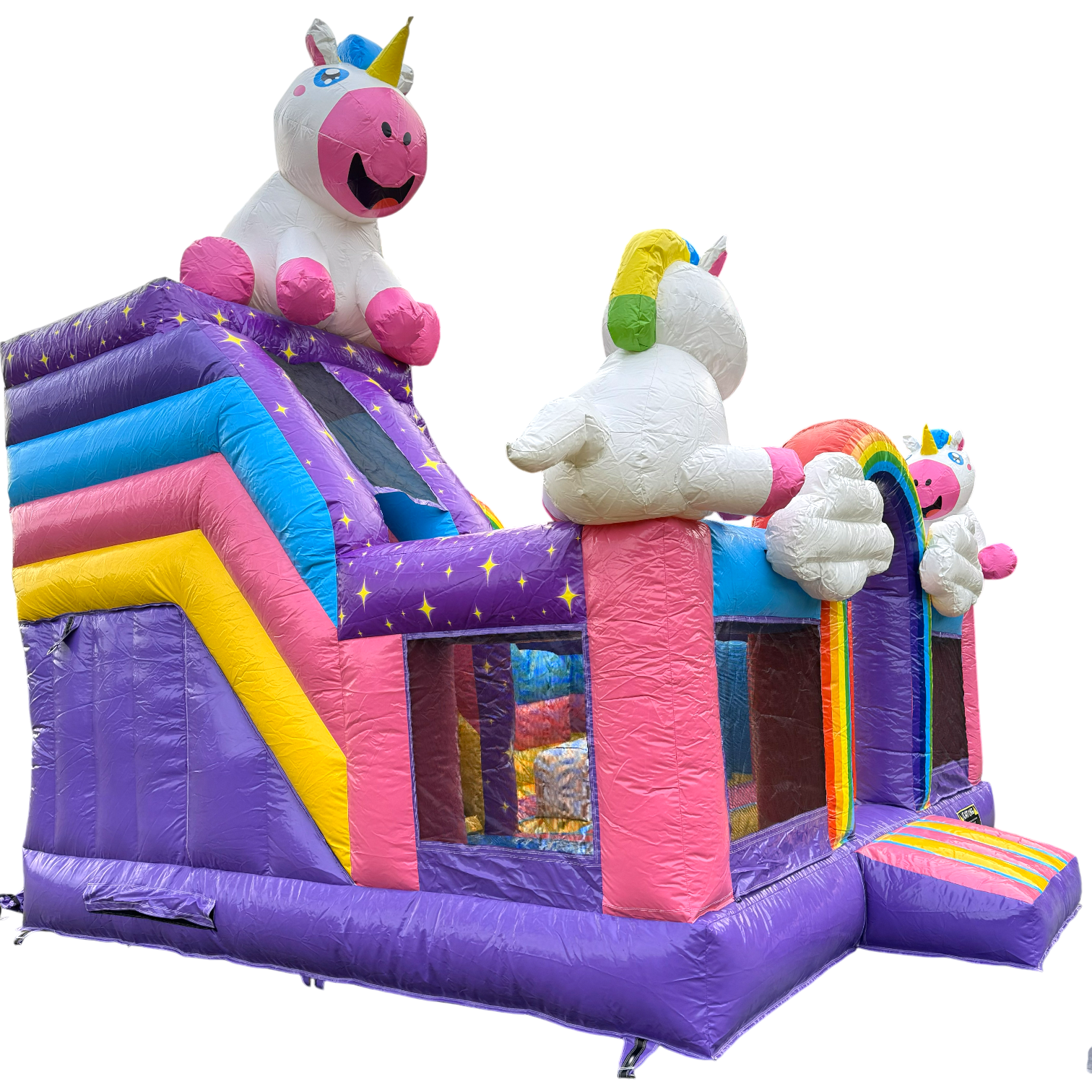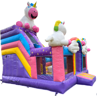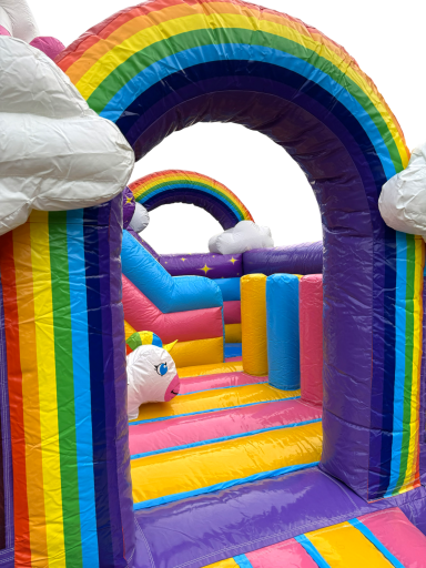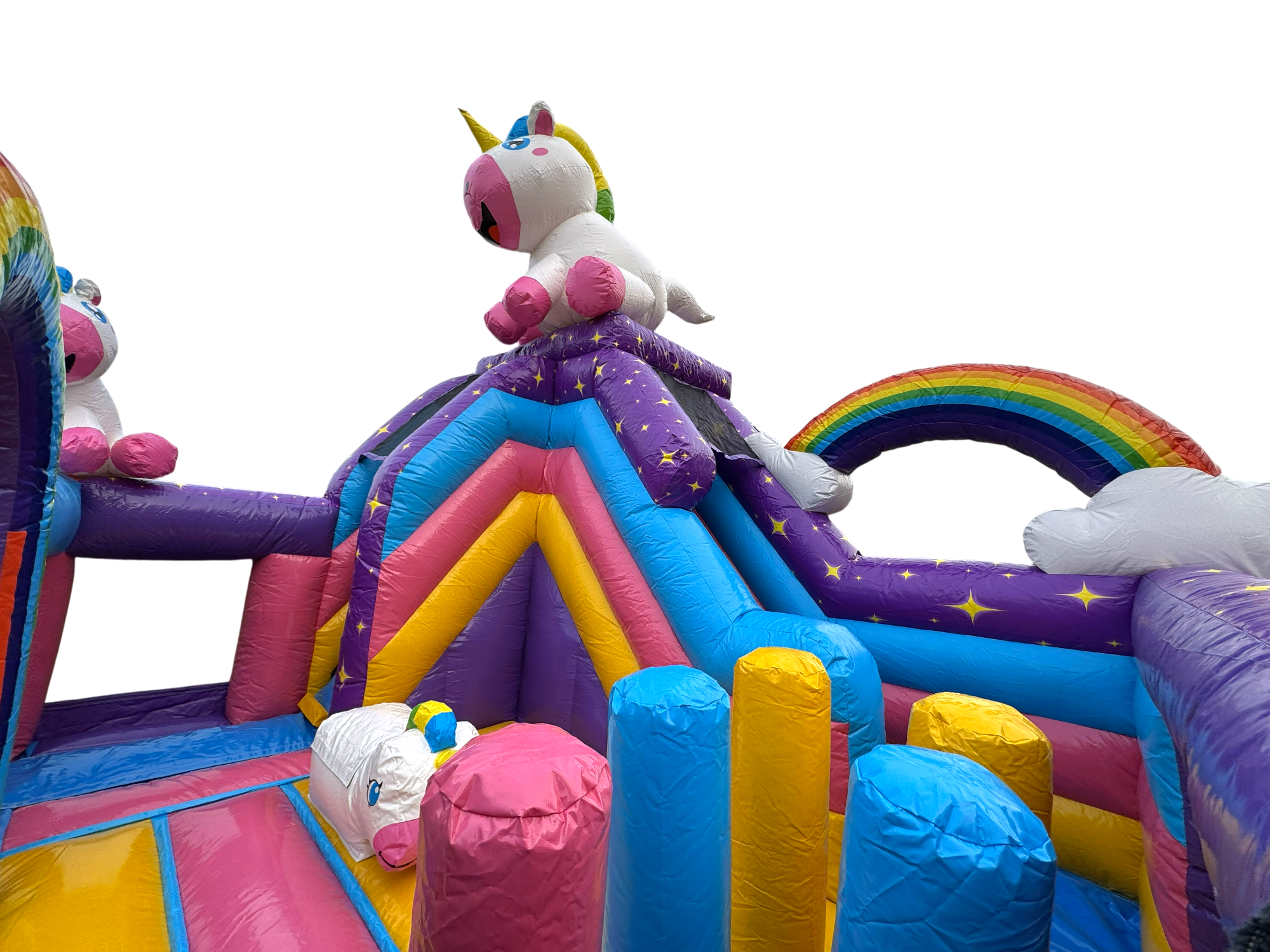 Diese traumhafte Hüpfburg im zauberhaften Einhorn-Design entführt Kinder in eine Welt voller Fantasie, Farben und Abenteuer. Mit niedlichen Einhörnern, flauschigen Wolken und einem strahlenden Regenbogen wird jedes Fest zu einem unvergesslichen Highlight!
